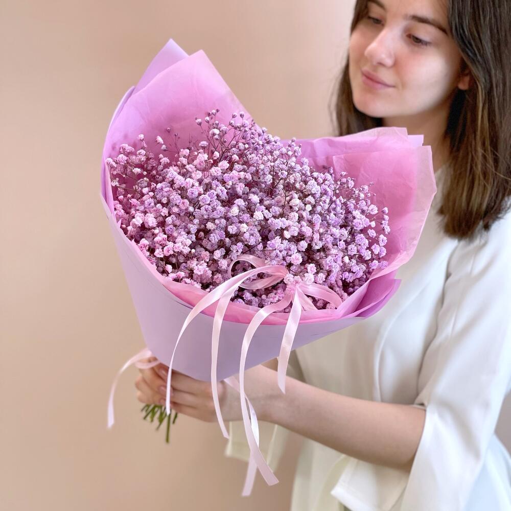 Радужная Гипсофила розового и фиолетового цвета в моно букете в стильном оформлении.